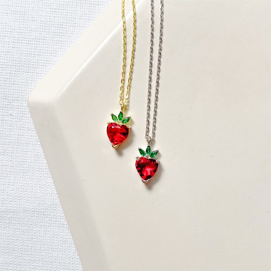 Kırmızı Taşlı Çilek Figürlü Kolye - 925 Ayar Gümüş | Cielza
