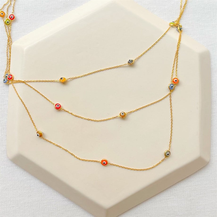Üç Sıra Renkli MineliGöz Figürlü Kolye - 925 Ayar Gümüş | Cielza